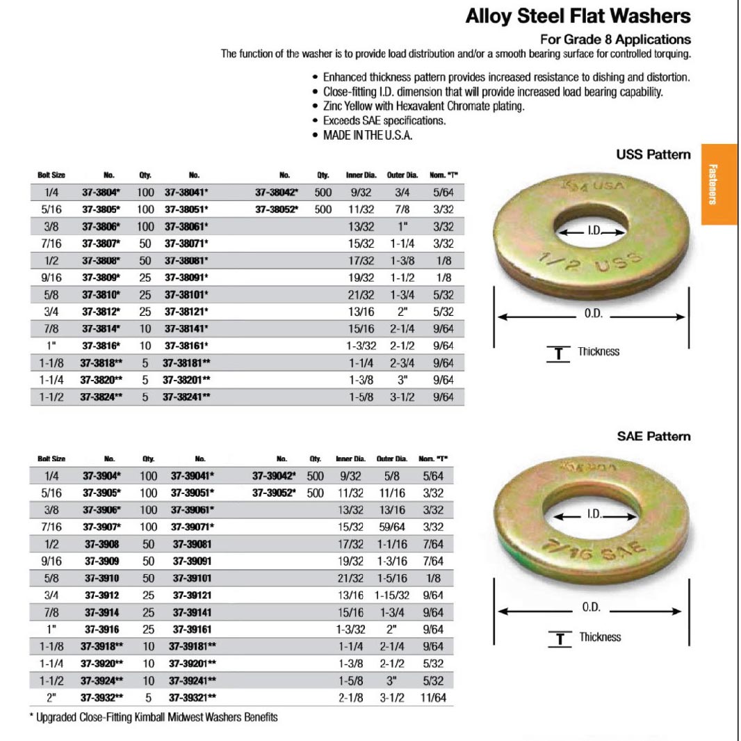 These premium alloy steel flat washers are engineered for high-strength Grade 8 applications. Featuring zinc yellow plating with Hexavalent Chromate, they offer increased resistance to dishing and distortion. The upgraded close-fitting I.D. enhances load-bearing capability, while the robust thickness profile meets or exceeds SAE specifications. Manufactured in the U.S.A., these washers are available in both USS and SAE patterns: