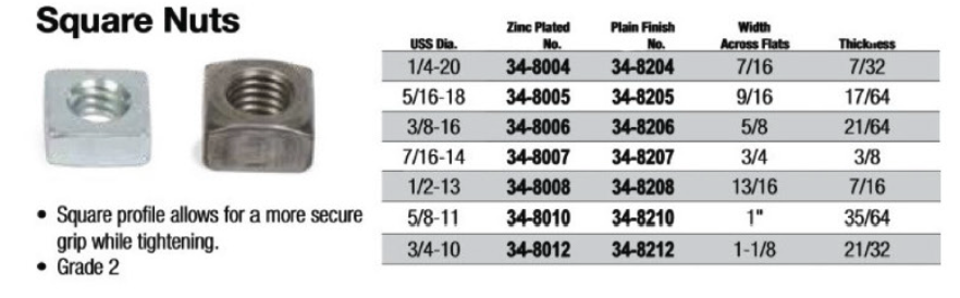 Square Nuts Square profile allows for a more secure grip while tightening Zinc plated Grade 2 construction USS (Coarse) No. SAE (Fine) No. Width Across Flats Thickness 1/4-20 34-8004 1/4-28 34-8204 7/16 17/32 5/16-18 34-8005 5/16-24 34-8205 9/16 17/64 3/8-16 34-8006 3/8-24 34-8206 5/8 21/64 7/16-14 34-8007 7/16-20 34-8207 3/4 3/8 1/2-13 34-8008 1/2-20 34-8208 […]
