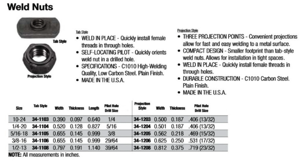Weld Nuts – Tab & Projection Style Quickly install female threads in through holes Tab style includes self-locating pilot for precise alignment Projection style features 3 projections for fast welding Made from C1010 high-quality low carbon steel Plain finish Made in the U.S.A. Tab Style Weld Nuts Size No. Width Thickness Length Pilot Hole Drill […]